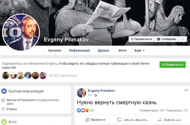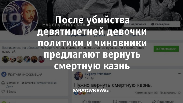 Депутат Госдумы Евгений Примаков вчера опубликовал на своей странице в Facebook листовку «Лизы Алерт». Такие листовки были расклеены по всему Саратову. Сегодня утром он запостил: «Нужно вернуть смертную казнь».