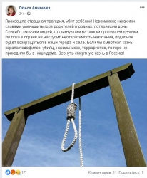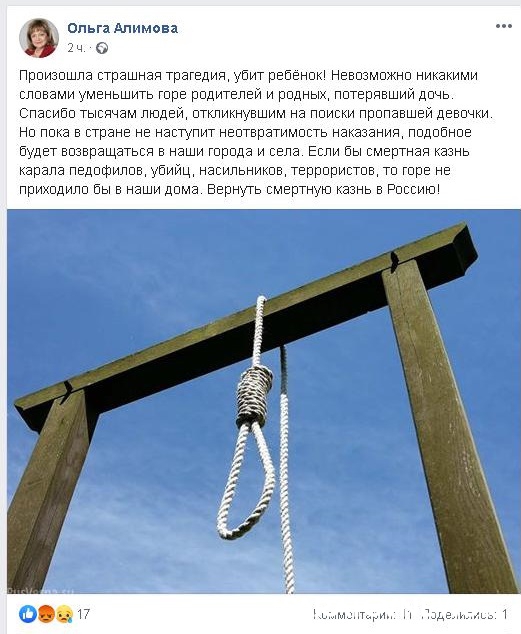 Первый секретарь саратовского обкома КПРФ и депутат Госдумы Ольга Алимова также высказалась в Facebook. Она выложила картинку с петлей и сопроводила её небольшим, но очень эмоциональным текстом, в котором, как и её коллега, высказала мысль о возвращении смертной казни для педофилов, убийц, насильников и террористов.