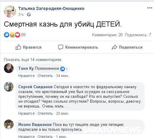 Уполномоченный по правам ребенка в Саратовской области Татьяна Онищенко тоже высказалась в Facebook о необходимости смертной казни для убийц детей.