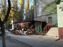 Судя по снимкам, временный деревянный павильон, пристроенный к угловому дому №1 комплекса Дома 8 Марта загорелся ночью, теперь на перекрестке валяются его обугленные обломки, а в воздух из глубины лотка периодически выносит пепел.