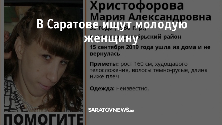 В Октябрьском районе Саратова пропала 33-летняя Мария Христофорова, сообщают волонтеры поискового отряда «Лиза Алерт».