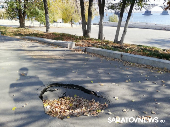На набережной Космонавтов в Саратове образовалось несколько новых провалов. В этом сегодня, 21 октября убедился корреспондент ИА SaratovNews.