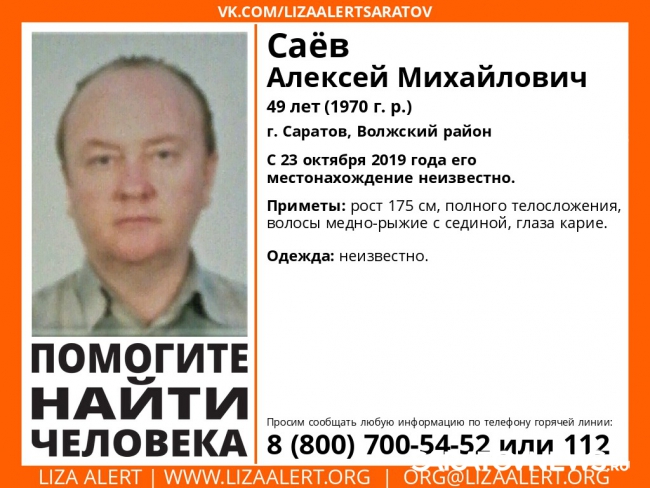 Розыск Алексея Саёва координирует Марина — 8-905-385-03-88. Также информацию, которая поможет в поиске мужчины, можно сообщить по телефонам 8-800-700-54-52, или 112.