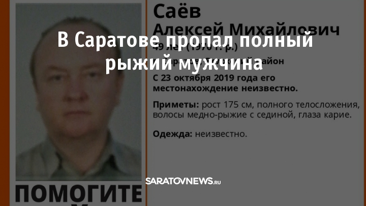 Мужчина ушел из дома 23 октября и сейчас его местонахождения неизвестно. Рост Алексея Саёва 175 сантиметров, он полного телосложения. Волосы медно-рыжие с сединой, глаза — карие. Во что был одет мужчина в момент исчезновения, неизвестно.