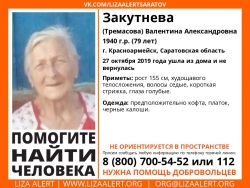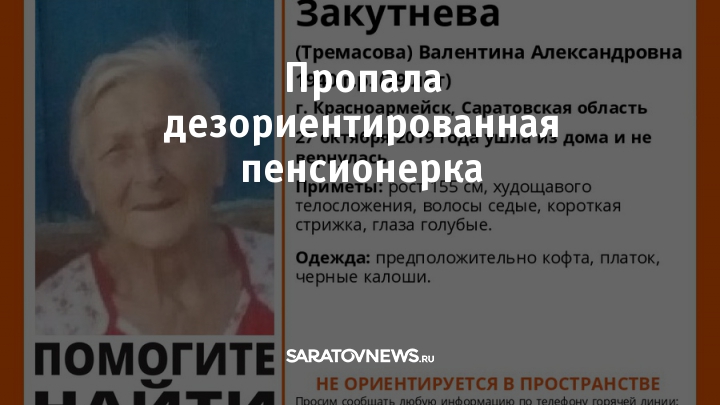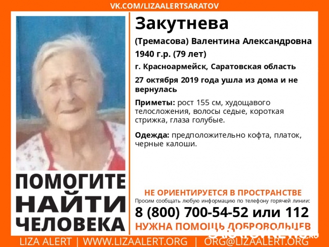Сегодня утром волонтеры поискового отряда «Лиза Алерт» выложили в группе своего саратовского отделения в ВК пост о пропавшей в Красноармейске Саратовской области Валентине Закутневой (Тремасовой).