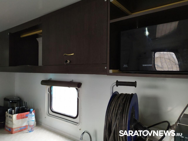 Маленькая кухонька с микроволновкой и раковиной, туалет, душ с горячей водой и четыре спальных места – для работы таможенной инспекции предусмотрены самые комфортабельные условия. «Наши машины оборудованы на базе КамАЗов и Фордов», — рассказали патрулирующие мост таможенники.