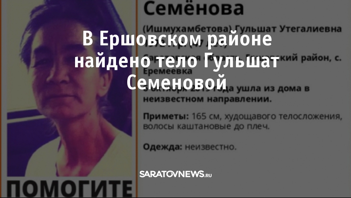 Тело Гульшат Семеновой найдено в Ершовском районе Саратовской области, сообщают волонтеры поискового отряда «Лиза Алерт».
