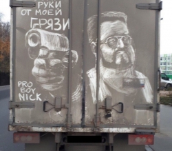 Портрет Робокопа, от которого отскакивает бутылка, появился на грязи на задних дверях ГАЗели. Рисунок подписан: «PROBOYNIKK».