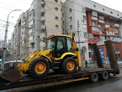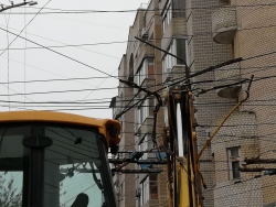 Как видно на снимках, ковш трактора зацепился за провода, что и привело к их повреждению. КамАЗ принадлежит службе «Благоустройства города», а перевозимый трактор явно предназначался для уборки мусора на улицах.