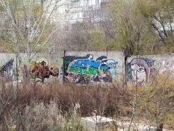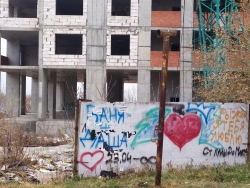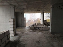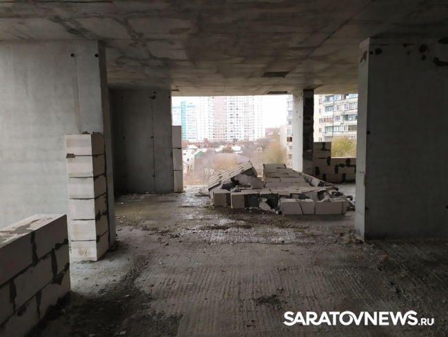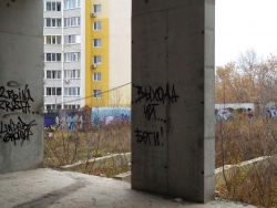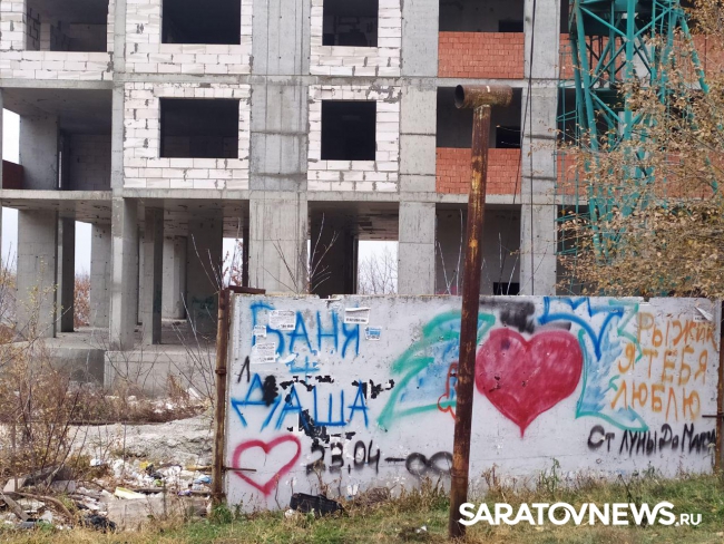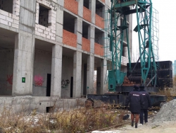 Рядом с недостроем стоит брошенный подъемный кран. Внутри и на заборе – множество надписей и граффити. В полу здания много дыр, шахта лифта ничем не огорожена. Рядом с лестницей валяется когда-то закрывавшая проход на верхние этажи решетка.