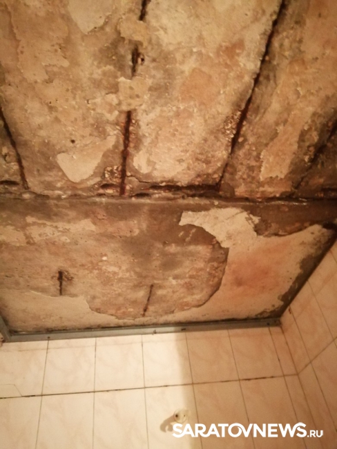 Как утверждает автор поста, пожелавший остаться анонимным, речь идет о доме № 14 на улице Новокрекингская в Саратове. На снимках, сделанных в ванной комнате, видно, что потолок в квартире давно требует серьезного ремонта. Практически полностью обнажились бетонные плиты с проржавевшей арматурой. Штукатурка отваливается от потолка крупными кусками, падает на пол и в ванную.