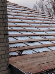 В одном из городских пабликов в социальной сети появились фото жилого дома, у которого вместо кровли установлены деревянные леса, на которые натянута пленка.