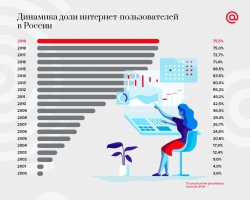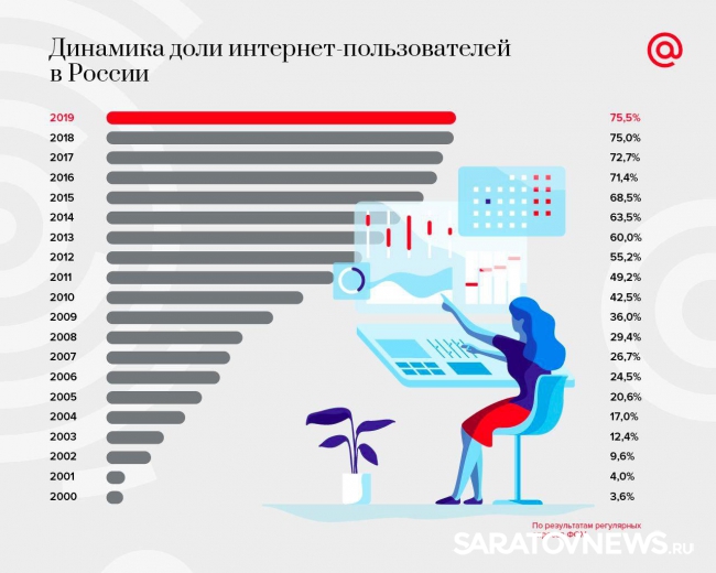 По результата исследования охватившего всю страну, на данный момент 75,5 процента россиян активно пользуются интернетом. С начала года эта цифра почти не изменилась: в 2018-м их таких граждан было 75 процентов. Зато, если посмотреть данные за все годы ведения статистики, то будет заметен колоссальный рост.