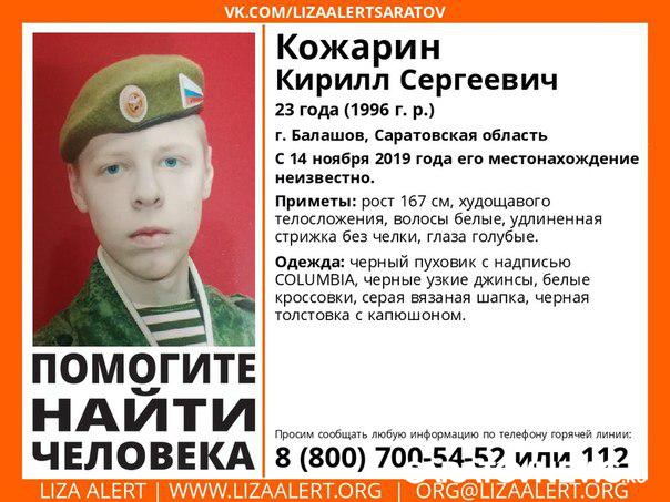 Сегодня вечером волонтеры поискового отряда «Лиза Алерт» разместили в своей группе в социальной сети пост о пропавшем в Балашове 23-летнем Кирилле Кожарине.