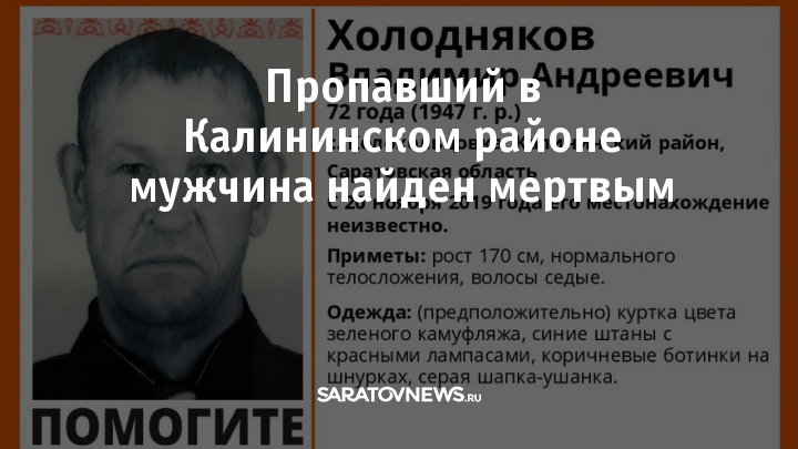 Вчера, 26 ноября, в селе Колокольцовка Калининского района Саратовской области нашли тело Владимира Холоднякова. Информация размещена в группе поискового отряда «Лиза Алерт» в социальной сети «ВКонтакте».