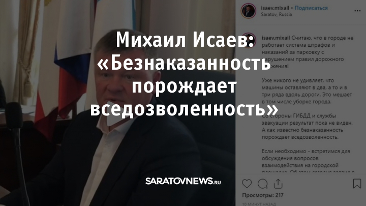 Вчера, 4 декабря, глава Саратова Михаил Исаев высказался о системе штрафов и наказаний за нарушение ПДД. Пост с критикой работы ГИБДД и службы эвакуации он разместил на своей странице в Instagram.