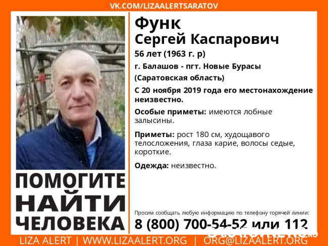 56-летнего Сергея Функа видели в последний раз 20 ноября. «Лиза Алерт» сообщает приметы мужчины: рост 180 сантиметров, худощавого телосложения, глаза карие, волосы седые, короткая стрижка, залысины на лбу. Во что Сергей был одет, неизвестно.