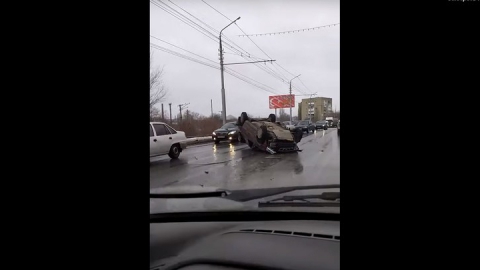 На видео видно опрокинутую красную Daewoo Nexia и поврежденную белую KIA Sportage.
