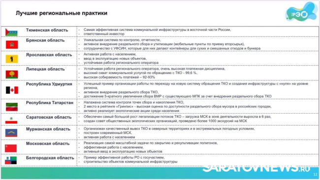 Региональный оператор Саратовской области филиал АО «Управление отходами» вошел в ТОП-10 рейтинга лучших региональных практик, составленный ППК «Российский экологический оператор». Рейтинг был презентован в рамках Международной выставки-форума «Чистая страна».