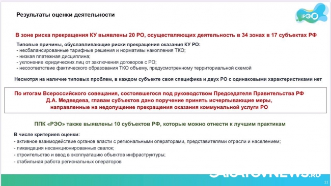 В то же время федеральные эксперты выделили типовые и специфические проблемы, региональных операторов. В качестве отраслевых проблем Саратовской области отмечены низкая стоимость транспортирования ТКО для мусоровывозящих компаний, слабое противодействие работе нелегальных перевозчиков мусора и уклонение юрлиц от заключения договоров с регоператором. По мнению экспертов, все эти вопросы можно урегулировать на региональном уровне.
