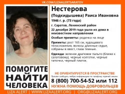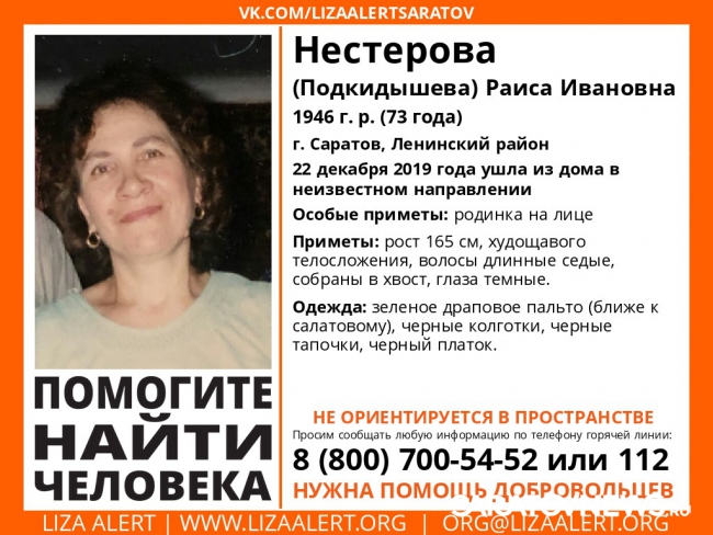 Вчера, 22 декабря, пропала 73-летняя Раиса Нестерова (Подкидышева). Бабушка ушла из дома в Ленинском районе и не вернулась. По имеющимся данным, женщина не ориентируется в пространстве. Приметы пропавшей: рост 165 сантиметров, худощавое телосложение, длинные седые волосы, собраны в хвост, темные глаза. Она была одета в зеленое драповое пальто, цвет ближе к салатовому, черные колготки, черные тапочки и черный платок.