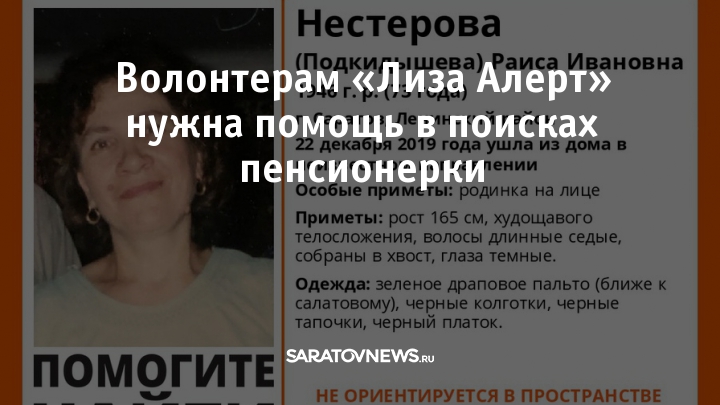 Волонтеры поискового отряда «Лиза Алерт» приглашают всех неравнодушных принять участие в поисках пенсионерки. Об этом корреспонденту ИА SaratovNews сообщил координатор саратовского отделения отряда Константин Костырин.