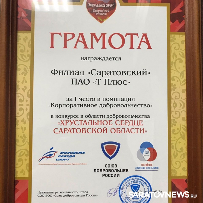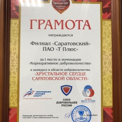 Сотрудники Саратовского филиала «Т Плюс» заняли первое место в областном конкурсе в сфере добровольчества «Хрустальное сердце Саратовской области» в номинации «Корпоративное добровольчество».