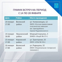 В четверг, 16 января, встречи с жителями состоятся на территории трех районов: Волжский – в 17:00 в Национальной татарской гимназии на Радищева, 32; Фрунзенский – в 18:00 в здании 77-й школе на Шелковичной, 141; Октябрьский – в 18:00 в 45-й школе на Дегтярной, 12.