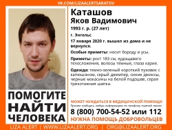 Яков Каташов ушел позавчера из дома и так и не вернулся. Поисковики сообщили приметы мужчины: худощавого телосложения, рост 183 сантиметра, темные волосы, карие глаза. Из особенных отличий: носит бороду и усы. Был одет в темно-зеленый короткий пуховик с капюшоном, серый джемпер, синиые джинсы, черные мокасины на белой подошве и серую трикотажную шапку.