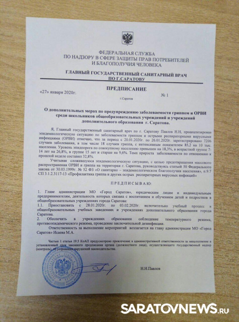 Однако в распоряжении редакции Saratovnews есть предписание главного санитарного врача Саратова Николая Павлова, в котором он предлагает приостановить занятия во всех образовательных учреждениях города с 28 января по 3 февраля 2020 года включительно.