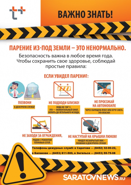 - сообщать о незакрытых или поврежденных люках тепловых камер на горячую линию «Т Плюс»: в Саратове — (8452) 32-00-22, в Балакове — (8453) 611-500, в Энгельсе — (8453) 55-75-08, а также на информационный портал http://teplo.energy/.