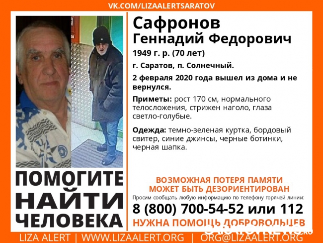 2 февраля пропал Геннадий Сафронов. Ему 70 лет. По имеющейся информации, мужчина может быть дезориентирован. Также возможна потеря памяти.