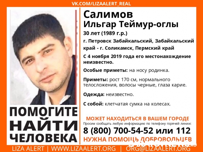 Пропал Ильгар Салимов Теймур-оглы, ему 30 лет. Местонахождение мужчины неизвестно с 4 ноября 2019 года. Ранее его искали в Иркутской области, Пермском, Забайкальском и Красноярском крае и Новосибирской области.