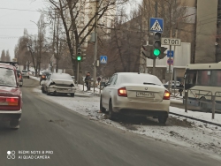 На пересечении проспекта Строителей и улицы Гусельская пострадали два автомобиля. Белая Daewoo Nexia стояла у светофора в крайне помятом состоянии. За ней, чуть в лучшем виде, была припаркована белая «Шкода».