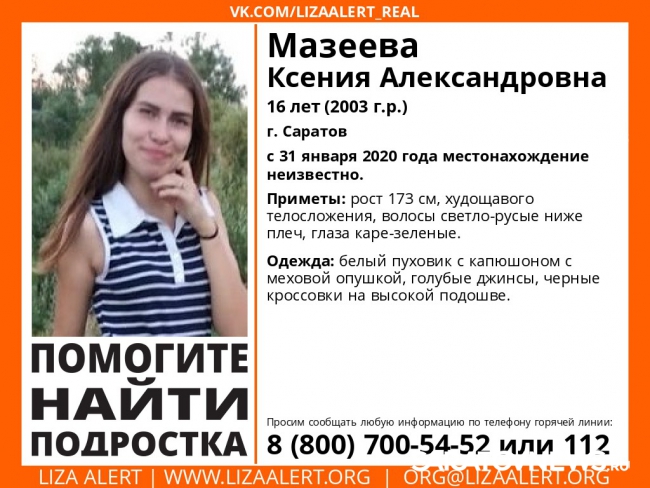 Волонтеры саратовского отделения поискового отряда «Лиза Алерт» разместили в своём сообществе информацию о пропавшем подростке. 16-летнюю Ксению Мазееву не видели с 31 января.