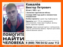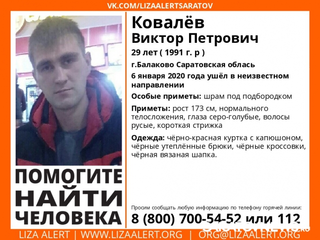 Волонтеры саратовского отделения поискового отряда «Лиза Алерт» разместили в своём сообществе информацию о пропавшем 29-летнем Викторе Ковалёве. Жителя Балакова Саратовской области не видели с 6 января.