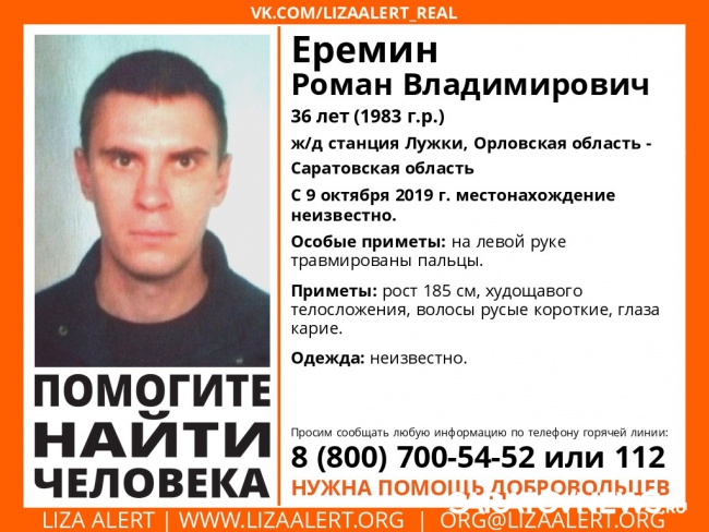 Роман Еремин в розыске с 9 октября 2019 года. В последний раз его видели на железнодорожной станции Лужки в Орловской области. Предположительно он направлялся в Саратовскую.
