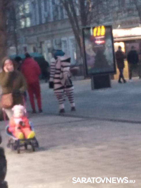 Пользователь сообщает, что, гуляя с подругой, решил проследить за зеброй-аниматором. «Она драла с ничего не подозревавших людей огромные деньги. В костюме был мужчина. Видели возле Макдоналдса ,будьте осторожны и не ведитесь на это», — предупреждает саратовец.
