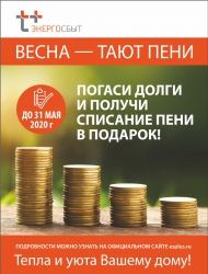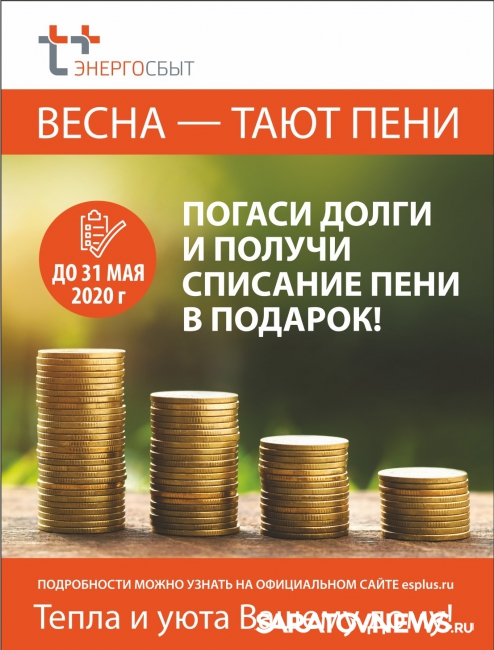 Саратовский филиал АО «ЭнергосбыТ Плюс» объявляет о начале традиционной акции «Весна – тают пени!» и предоставляет своим клиентам еще одну возможность оплаты долгов на льготных условиях. По условиям акции, при оплате клиентом задолженности за отопление и горячую воду в период со 2 марта по 31 мая ему обнуляется пени. Акция проводится филиалом уже в третий раз.