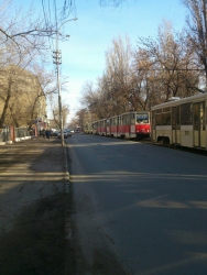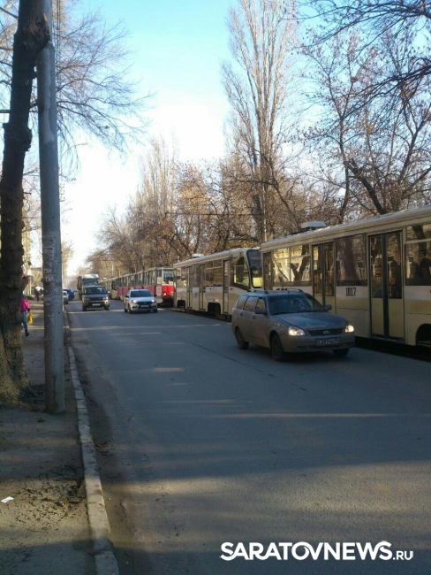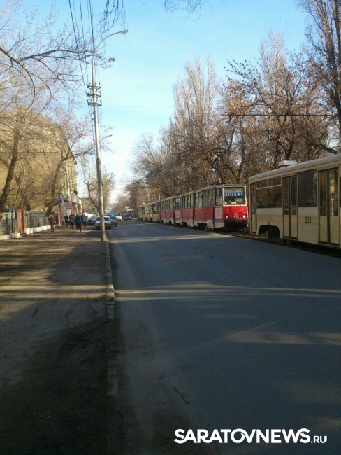 Сегодня, 2 марта, в центре Саратова остановилось огромное количество трамваев. По словам очевидца, они образовали целый «караван» у Детского парка.