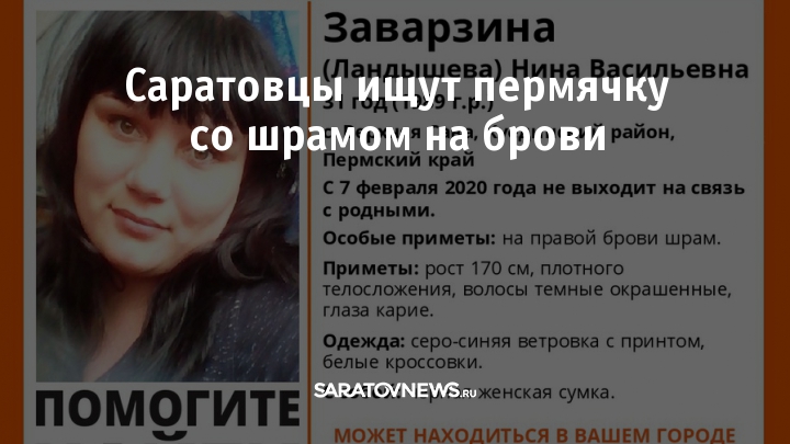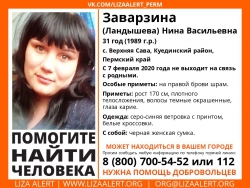 31-летняя Нина Заварзина (Ландышева) находится в розыске еще с 7 февраля. Жительница села Верхняя Сава Куединского района Пермского края не выходит на связь с родными. По имеющейся информации, она может находиться в Саратове.