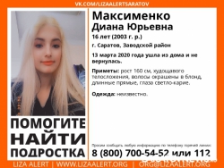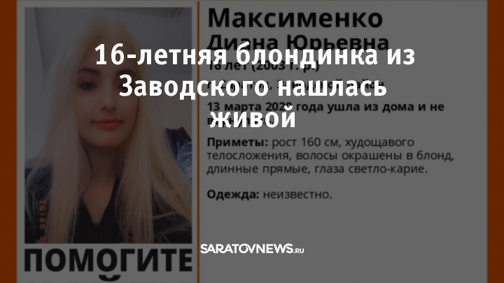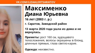 Сегодня, 16 марта, нашлась 16-летняя Диана Максименко, пропавшая в Заводском районе Саратова. Девушка жива.