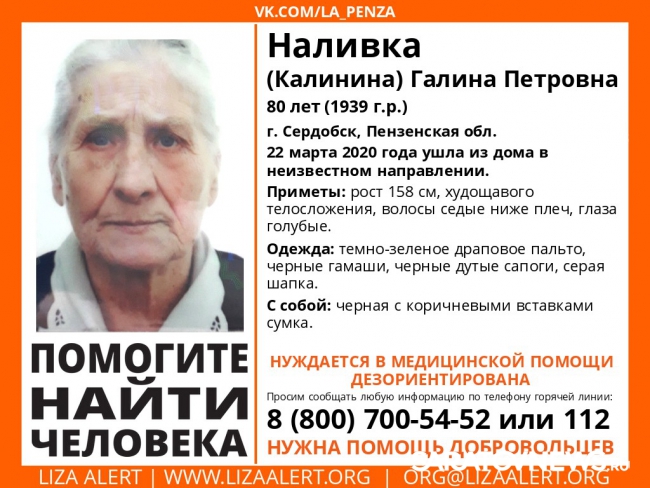 Наливка Галина Петровна 22 марта ушла из дома в неизвестном направлении. Бабушка нуждается в медицинской помощи - она дезориентирована.