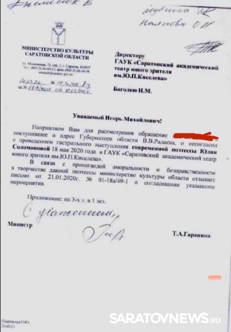 В своем сообществе в Facebook известная поэт и режиссер Сола Монова (Юлия Соломонова) разместила обращение минкульта Саратовской области к директору саратовского ТЮЗа Игорю Баголею. Выступление поэтессы отменяют из-за «аморальности».