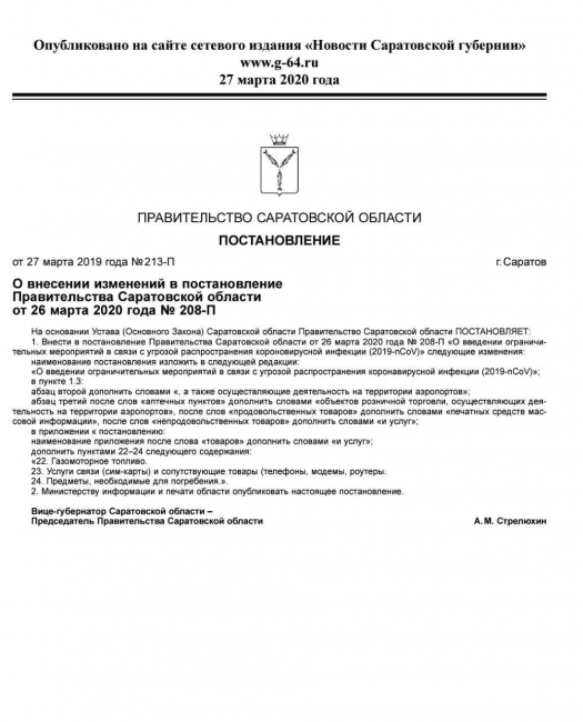 Правительство Саратовской области внесло изменения в постановление 208-П, вводящее ограничительные меры в связи с угрозой распространения коронавируса. Вице-губернатор Александр Стрелюхин подписал соответствующий документ.