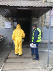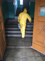 Специалисты в защитных костюмах и масках орошают поверхности стен, пола и потолка дезинфицирующим хлорным раствором. Например, сотрудники УК «Авиатор» сегодня планируют обойти 15-20 домов, а завтра оставшиеся из 34, что находятся в их зоне ответственности.