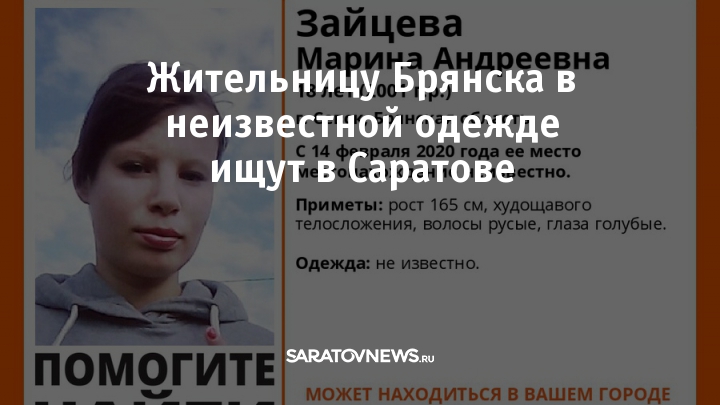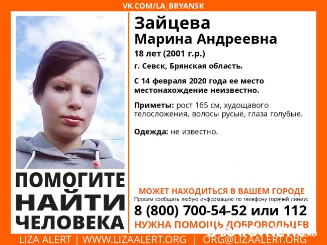 18-летняя Марина Зайцева проживает в городе Севск, Брянской области. С 14 февраля 2020 года ее местонахождение неизвестно. Родственники пропавшей обратились к волонтерам поискового отряда за помощью. По имеющейся информации, девушка может находится в Саратове или области.