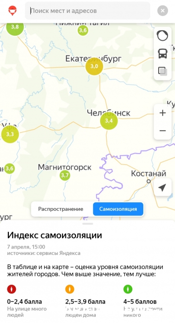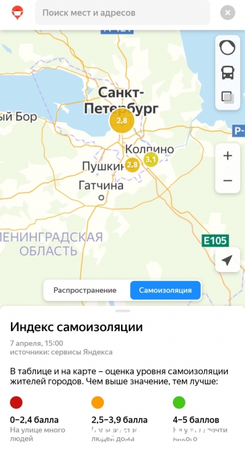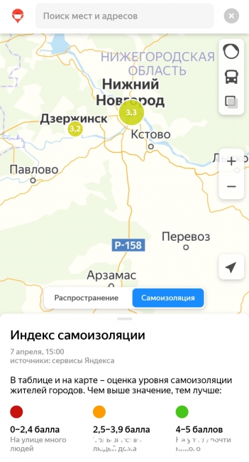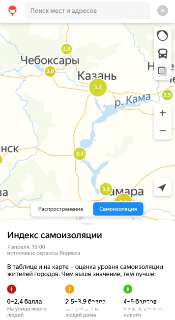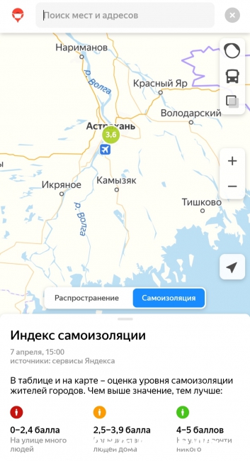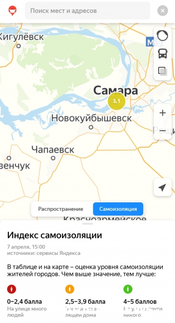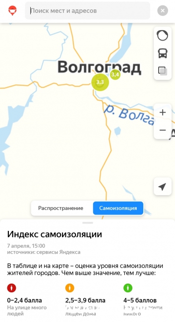 Индекс самоизоляции, согласно информации сервиса, в Саратове и Энгельсе составляет 3,4 пункта по пятибалльной шкале, где 5 означает максимально возможный минимум людей на улицах. Из этого следует, что большинство саратовцев всё-таки остается дома.