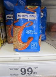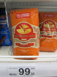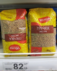 Несмотря на то, что рубль потихоньку укрепляется к доллару и евро, а продуктовый ажиотаж в продовольственных сетях давно закончился, стоимость любимой народом гречневой крупы за последнюю неделю существенно выросла. Так, в гипермаркете «Ашан» выставлена гречка стоимостью от 82 до 99 рублей за упаковку весом в 800 и 900 граммов. Таким образом, цена килограмма гречки-ядрицы составила 110 рублей за килограмм. Крупа, которая еще месяц тому назад продавалась по 45-55 рублей за упаковку, теперь сравнялась с рисом, цена которого на прошлой неделе взлетела до 100-110 рублей за килограмм.