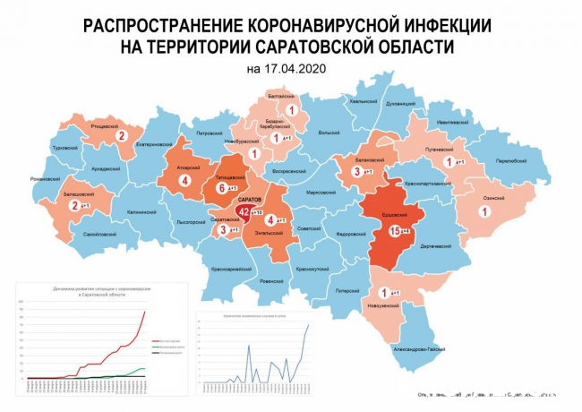 На 17 апреля в регионе зафиксировано 87 случаев заболевания в 15 муниципальных образованиях, к которым со вчерашнего дня добавился Пугачевский район. Там появился один пациент. Лидером по числу зараженных закономерно остается областнйо центр. Кроме того, особо выделяется Ершовский район, где за последние сутки было подтверждено четыре новых случая. Теперь всего их 15. Такая вспышка инфекции послужила причиной принятия жестких карантинных мер на территории района.